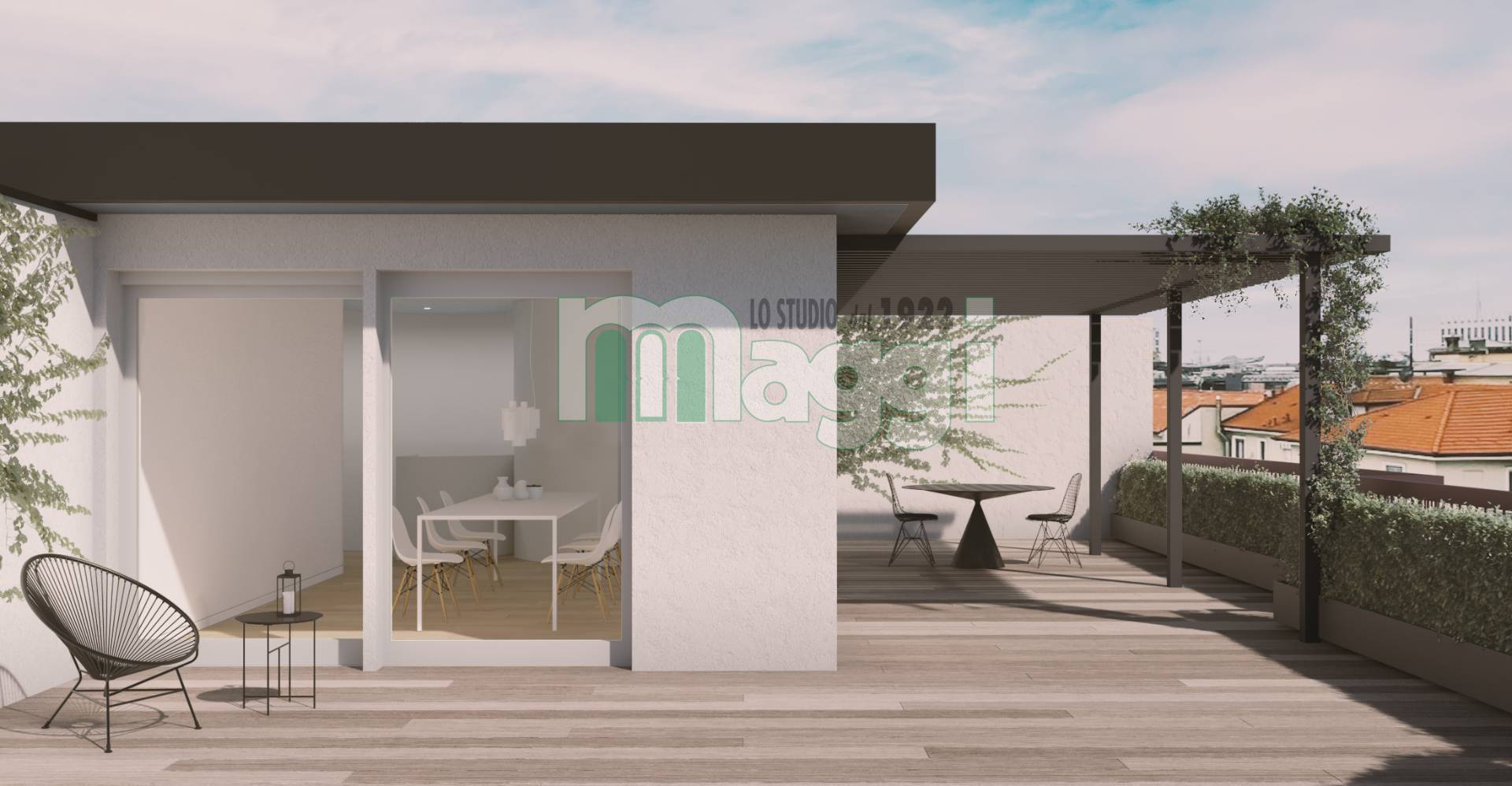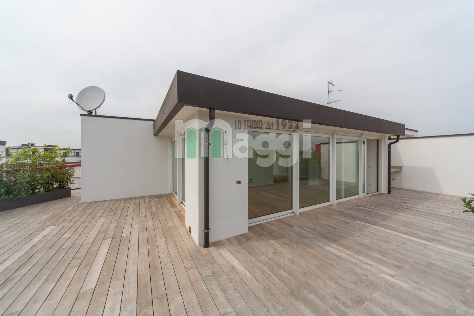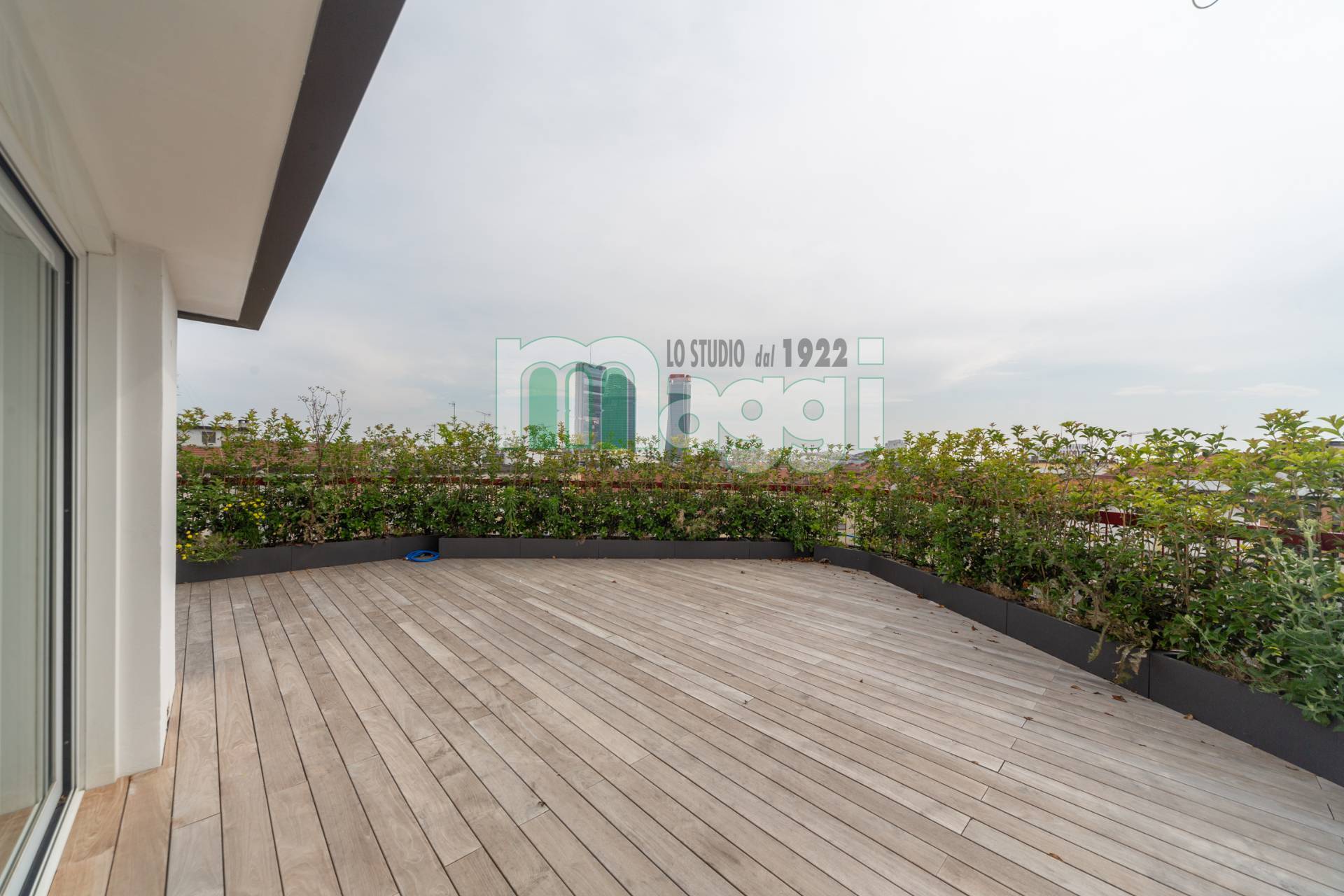 Il terrazzo di 100 mq. realizzato con doghe di Teak per esterni è dotato di impianto di irrigazione.