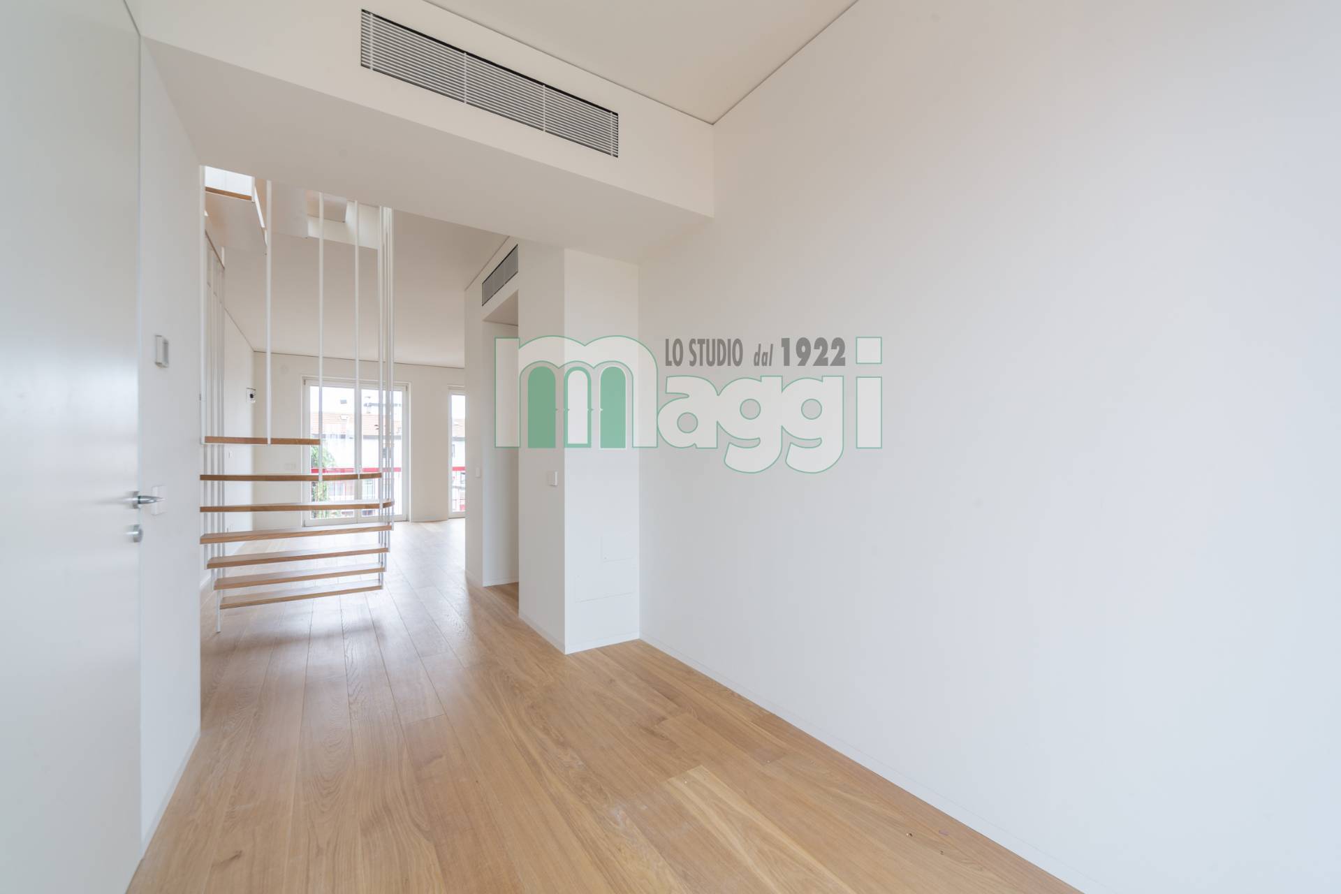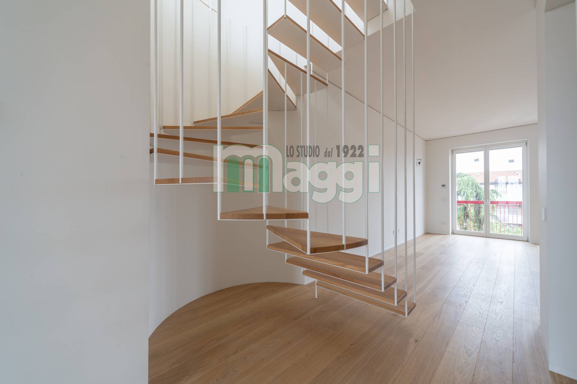 Una scala particolare, è realizzata con tiranti sospesi in acciaio verniciato, i gradini sono in rovere naturale e conducono al nono piano , dove un luminoso ambiente accoglie la cucina e la sala da pranzo.