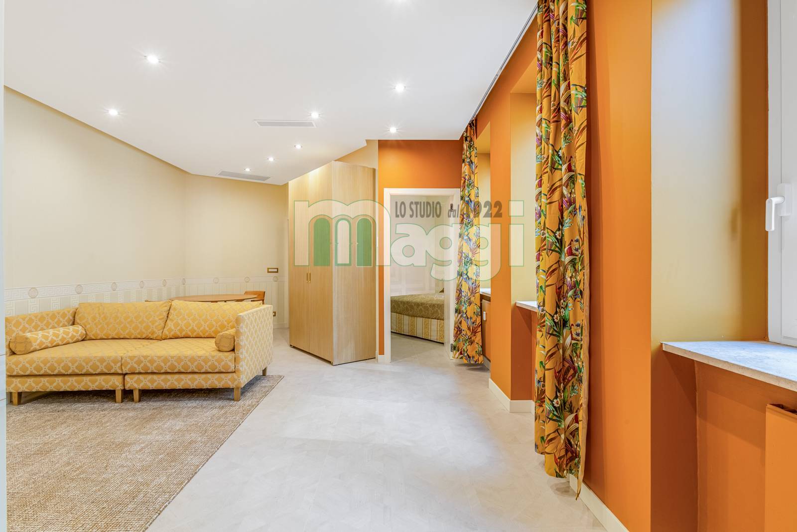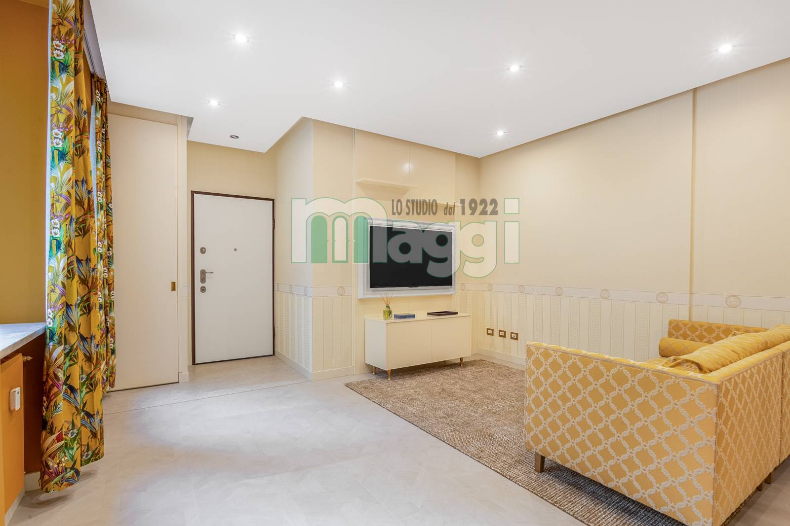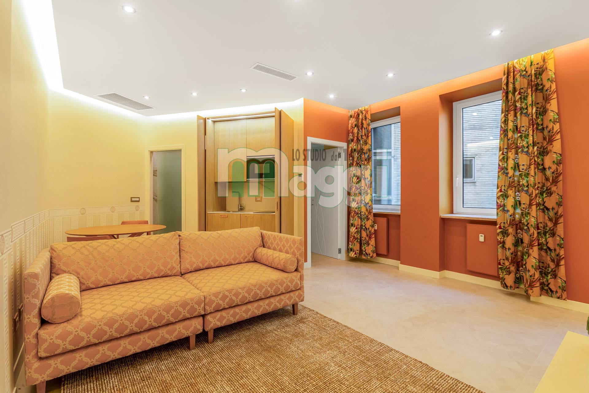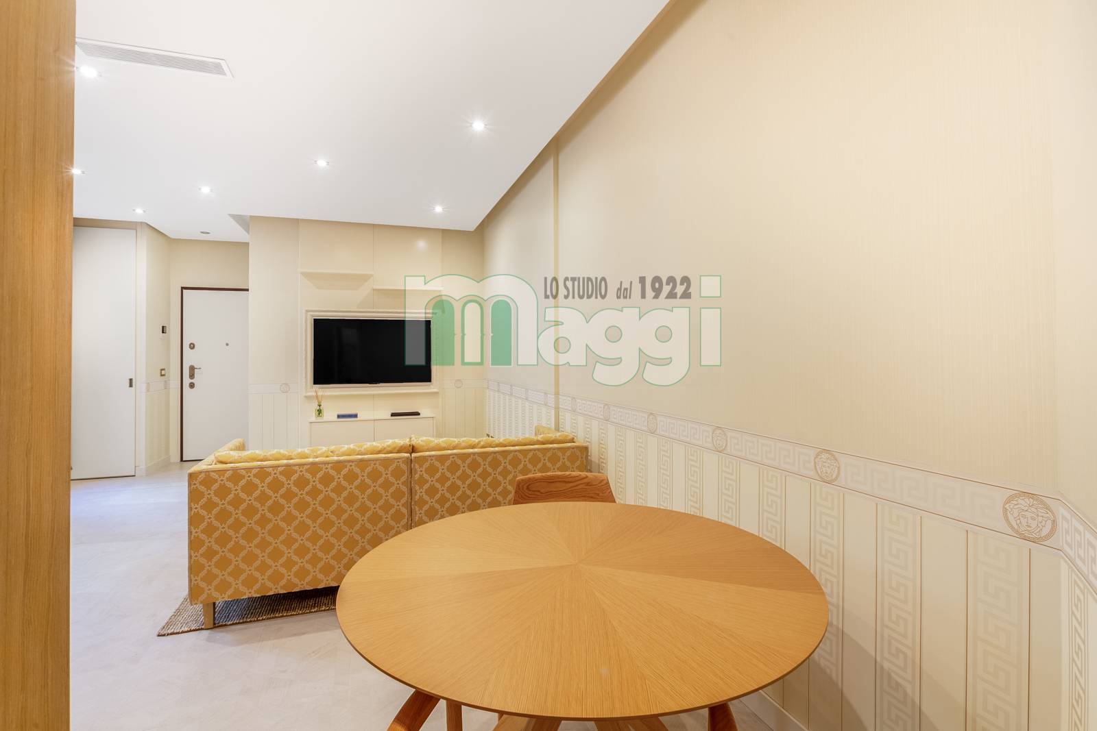 L'Appartamento si compone di due locali, l’arredamento di altissimo livello con mobili studiati ad hoc, un incantevole soggiorno composto da un divano, un mobile televisione, un angolo pranzo con un tavolo rotondo e le sedie rivestite in tessuto. La cucina è a scomparsa in legno di rovere come il tavolo. Il pavimento è in gres porcellanato Versace effetto legno, come la carta da parati sempre Versace in una tonalità delicata che riveste il soggiorno e la camera da letto. Il bagno è diviso da un antibagno con le pareti tutta altezza rivestite in gres tipo marmo, il lavabo è dello stesso materiale, la doccia e i sanitari come le rubinetterie sono di un’azienda di alto livello. L'affaccio interno lo rende silenzioso, l'illuminazione naturale è garantita da 3 ampie finestre. L'Appartamento ha un sistema di domotica e un condizionamento con pompa di calore ed è dotato di allarme perimetrico. Completa la proprietà una cantina pertinenziale all’interno del palazzo.