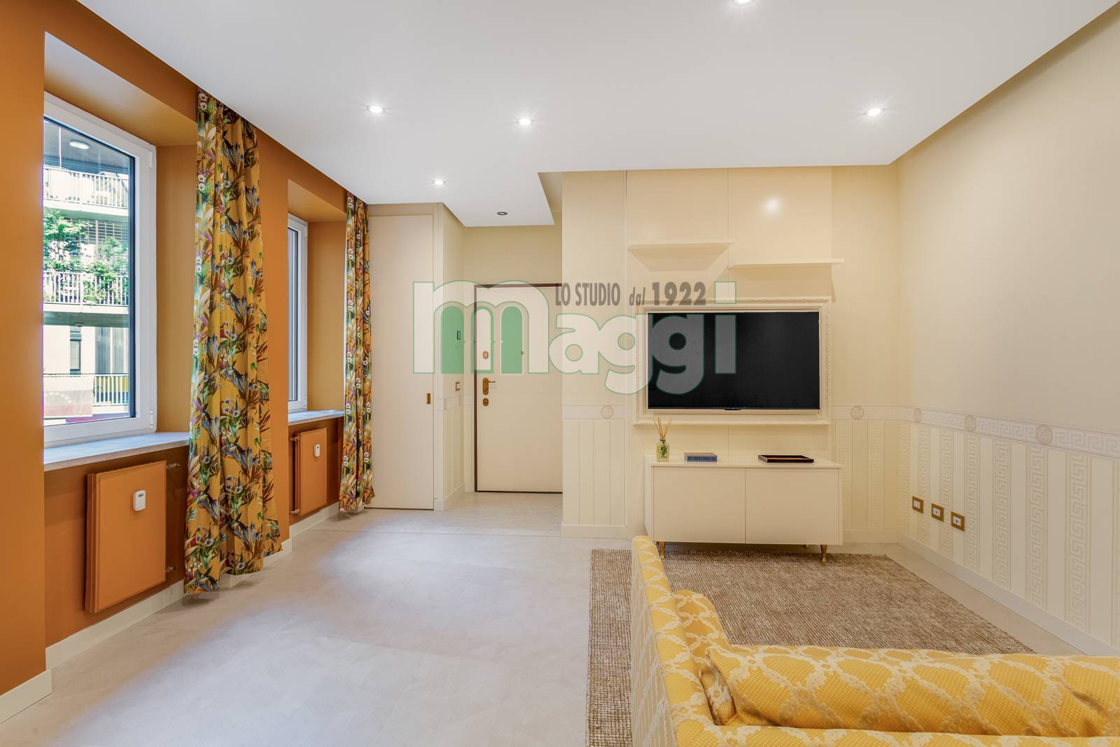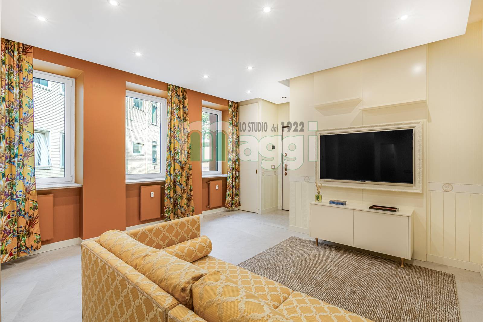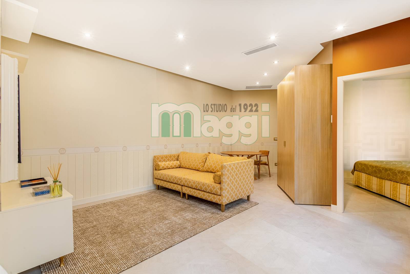 L'Appartamento si compone di due locali, l’arredamento di altissimo livello con mobili studiati ad hoc, un incantevole soggiorno composto da un divano, un mobile televisione, un angolo pranzo con un tavolo rotondo e le sedie rivestite in tessuto. La cucina è a scomparsa in legno di rovere come il tavolo. Il pavimento è in gres porcellanato Versace effetto legno, come la carta da parati sempre Versace in una tonalità delicata che riveste il soggiorno e la camera da letto. Il bagno è diviso da un antibagno con le pareti tutta altezza rivestite in gres tipo marmo, il lavabo è dello stesso materiale, la doccia e i sanitari come le rubinetterie sono di un’azienda di alto livello. L'affaccio interno lo rende silenzioso, l'illuminazione naturale è garantita da 3 ampie finestre. L'Appartamento ha un sistema di domotica e un condizionamento con pompa di calore ed è dotato di allarme perimetrico. Completa la proprietà una cantina pertinenziale all’interno del palazzo.
