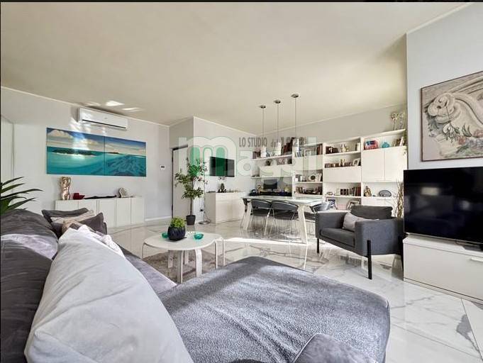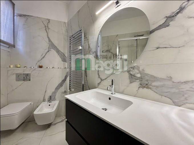 La zona notte offre due spaziose camere da letto e due bagni. Le finiture sono di altissima qualità: dai pavimenti in Kerlite effetto Marmo Bianco Statuario agli infissi con doppi vetri e all'aria condizionata. L'attenzione ai dettagli si nota negli armadi e nella cucina, tutti realizzati su misura.